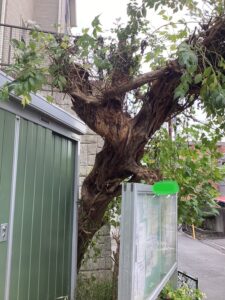 倒れた先は地域の掲示板です。ものすごいピンポイントで掲示板の上にひと枝だけで支えられている状態でした。