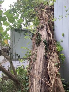 高さは余りない枯れたトウカエデでしたが、ノウゼンカヅラが巻き付いており、トウカエデ枝の先まで覆っている状態でしたのでトウカエデまで日光が当たらずに衰退・枯死したのだろうと推測できました。
