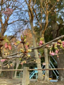 そんな中、近くの公園でピンク色に染まった可愛い緋寒桜の蕾が綻び始めていました。